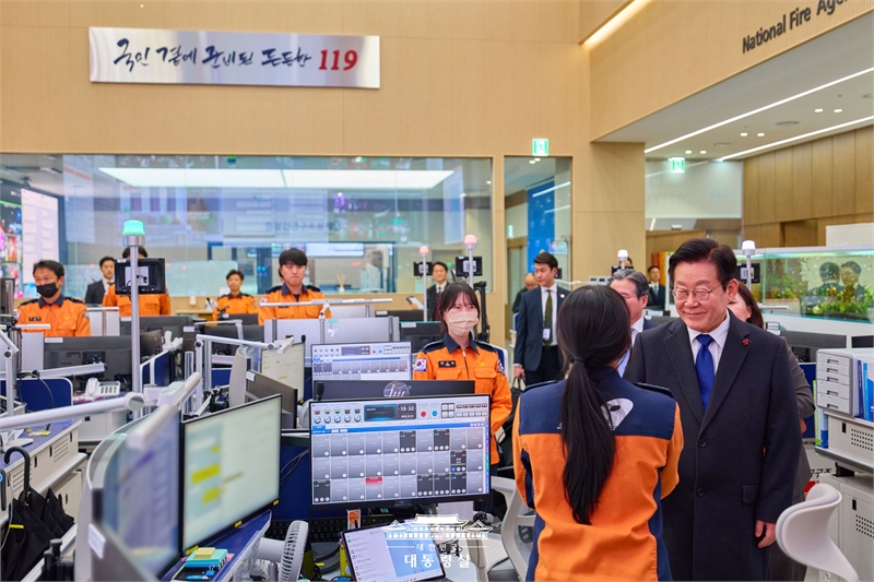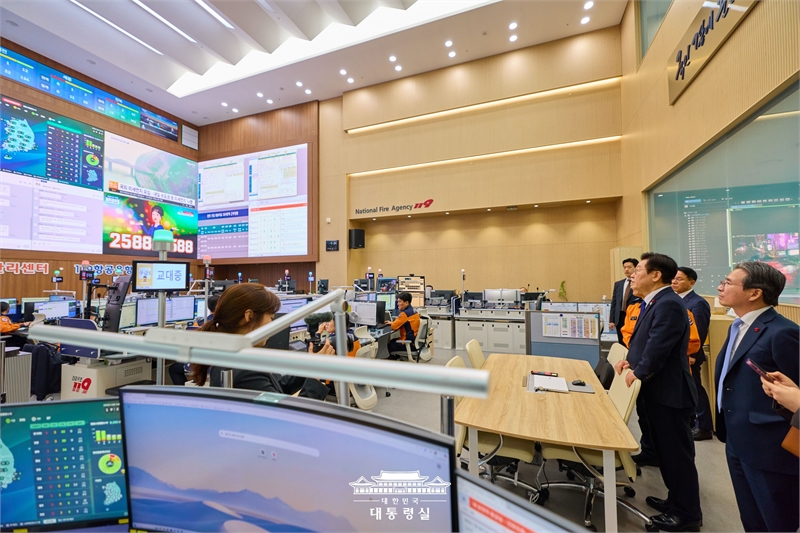 대통령은 먼저 소방청 119 종합상황실을 방문해 긴급 신고 접수와 출동 지휘 등 대응 현장을 직접 살폈고 이어서 중앙119 구급 상황 관리센터와 119 항공 운항 관제실에서 국민의 생명과 안전을 지키는 소방대원들의 노고를 치하했다.