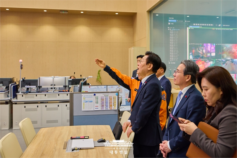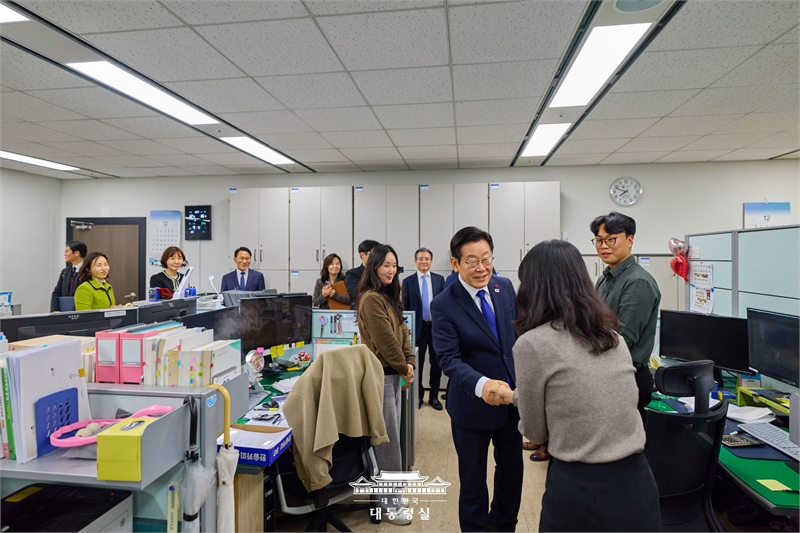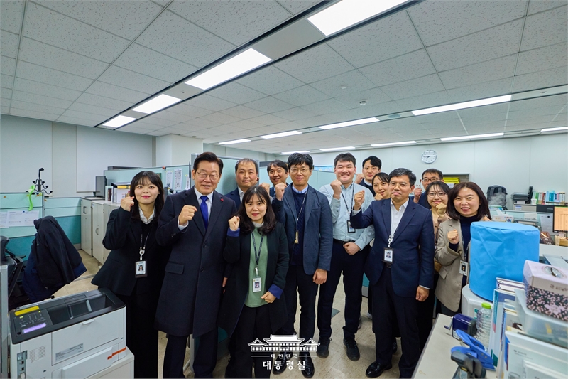 이재명 대통령은 12월16일(화) 저녁, 세종 컨벤션센터에서 진행된 부처 업무 보고를 마치고, 국민 안전과 국가 재원 조달 업무를 맡고 있는 현장을 찾아 늦은 시간까지 격무 중인 공직자들을 격려했다.